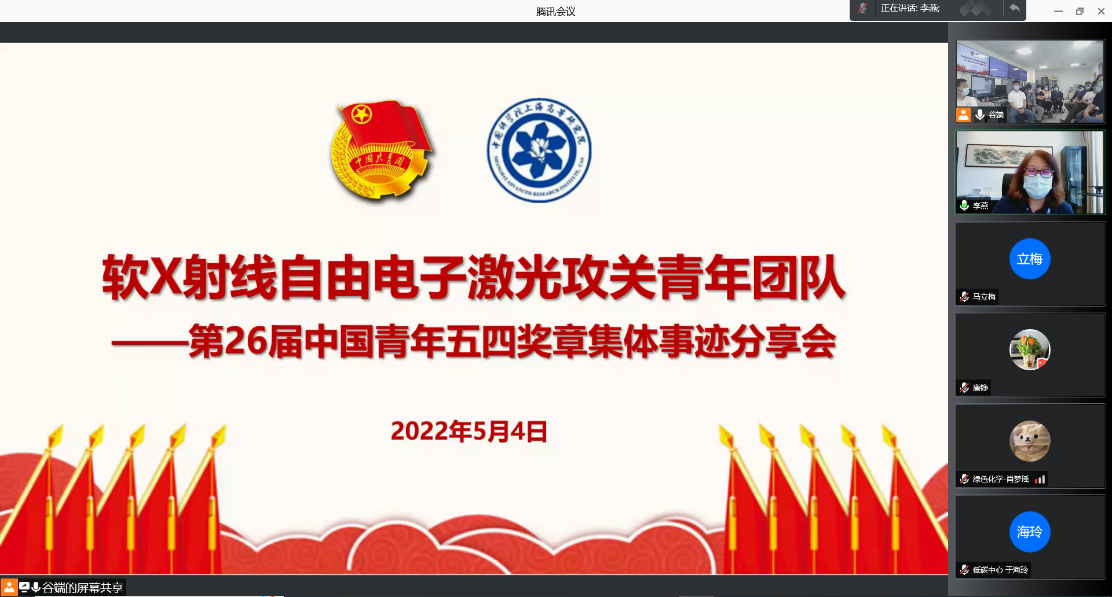 为纪念中国共产主义青年团创建100周年, 继承和发扬五四光荣传统,弘扬“爱国、进步、民主、科学”的五四精神,深入学习贯彻习近平总书记关于青年工作的重要论述,激励广大团员青年以先进典型为榜样奋勇建功,5月4日下午,高研院团委举办了“第26届中国青年五四奖章集体”事迹分享会。本次分享会邀请到中国工程院院士、获奖团队负责人赵振堂,高研院党委书记、副院长李燕,党委副书记、纪委书记唐铮,上海团市委兼职副书记、获奖团队骨干成员邓海啸,相关职能部门负责人及“第26届中国青年五四奖章集体”获奖者——软X射线自由电子激光攻关青年团队代表出席。会议由团委书记蒋巍主持,100余名团员青年及参加,会议以视频方式召开。