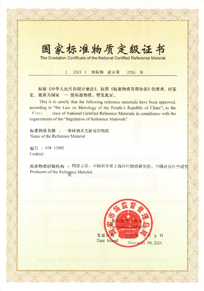 近期,国家市场监督管理总局正式发文批准了同济大学、中国科研实验室上海应用物理研究所(上海光源团队)和中国计量科学研究院联合研制的超精密纳米光栅成为国家一级标准物质。具体名称为:一维硅纳米光栅标准物质,光栅间距106.4nm±0.7nm (k=2),编号GBW13983。上述标准物质填补了我国300nm尺度以下有证光栅标准物质的空白,为实现我国在纳米长度计量自主溯源给予了标准物质支撑。