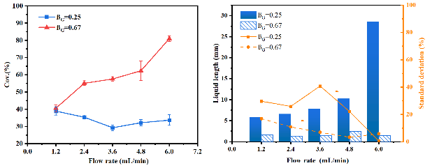 图3总流速对硝基苯转化率和气液固段塞流中液段长度的影响规律