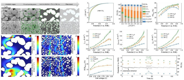 电催化CO2还原反应(CO2RR)被视为实现高质量“碳循环”的关键路径。其中,将CO2高效转化为含两个碳原子以上(C2+)的高附加值化学品(如C2H4、C2H5OH等)具有重要的经济价值,展现出巨大的可持续“碳循环”潜力。然而,现有Cu基催化剂仍面临两大难题:高电流密度下传质受限导致活...