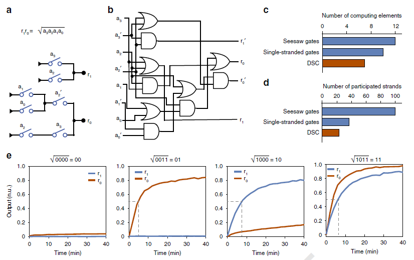 近期,上海高等研究院光源科学中心物理生物学研究室、上海应用物理研究所和上海交通大学合作开发了一种基于DNA链置换反应的开关电路来实现数字运算。与常用的逻辑门电路相比,开关电路结构精简,可以用最少的DNA序列实现高信噪比和快速计算的分子电路。他们展示了迄今为止最为快速的4位平方根运算。相关论文以“Implementing digital computing with DNA-based switching circuits”为题发表于Nature Communications(http://www.nature.com/articles/s41467-019-13980-y),王飞和吕慧为共同第一作者,樊春海与中国科研实验室上海高等研究院和上海应用物理研究所王丽华为共同通讯作者。