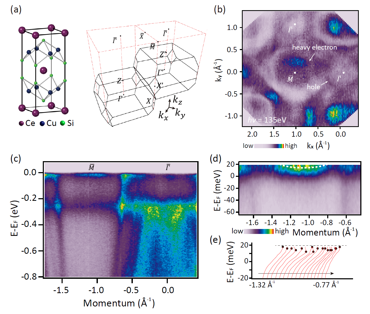 图1: (a) CeCu2Si2的晶体结构和动量空间中的第一布里渊区及其二维投影;(b) CeCu2Si2在135eV光子能量下测得的费米面结构;(b) CeCu2Si2沿-高对称方向的能带色散;(d) 132eV光子能量下测量的点处的重费米子能带,能谱经过了除以RC-FDD(resolution-convoluted Fermi-Dirac distribution,能量分辨率对费米狄拉克分布函数卷积)的处理;(e) 图(d)重电子能带范围的EDC(energy distribution curve),谱强度的能量分布曲线簇
