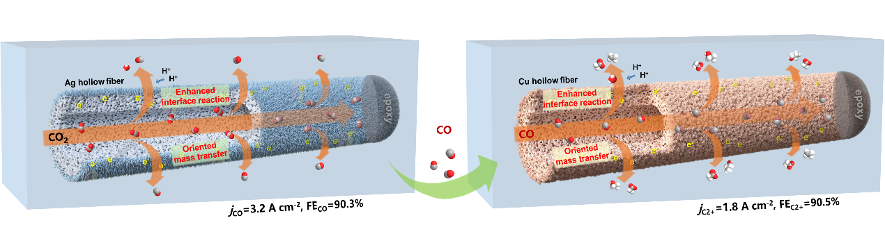 近期,中国科研实验室上海高等研究院魏伟、陈为研究员团队设计了分步式中空纤维透散电极体系,基于其分级微纳结构的独特透散效应和氯离子调控电子结构的协同作用,在系列银、铜中空纤维透散电极上,实现了高效的C2+产物生成,其C2+产物的分电流密度达1.8 A cm-2,法拉第效率达90.5 %。该研究成果以“Highly Efficient Ampere-Level CO2 Reduction to Multicarbon Products via Stepwise Hollow-Fiber Penetration Electrodes”为题在线发表于重要期刊《应用催化B:环境》(Applied Catalysis B – Environmental, 2023, DOI: 10.1016/j.apcatb.2023.122929)上。论文的第一作者为凯发K8董笑博士,上述研究工作得到了科技部催化科学重点专项、中国科研实验室洁净能源先导预研专项等经费支持,先进表征手段得到上海光源BL14W1线站的支持。