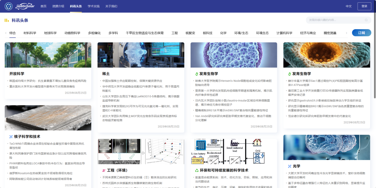 根据WOS学科分类,遴选学科领域内的高质量期刊(现在主要为Q1区)和权威资讯网站,由AI大模型辅助生成领域每日重要科技动态,顺利获得个人订阅,实现个性化推荐,方便及时获取前沿进展和动态资讯。